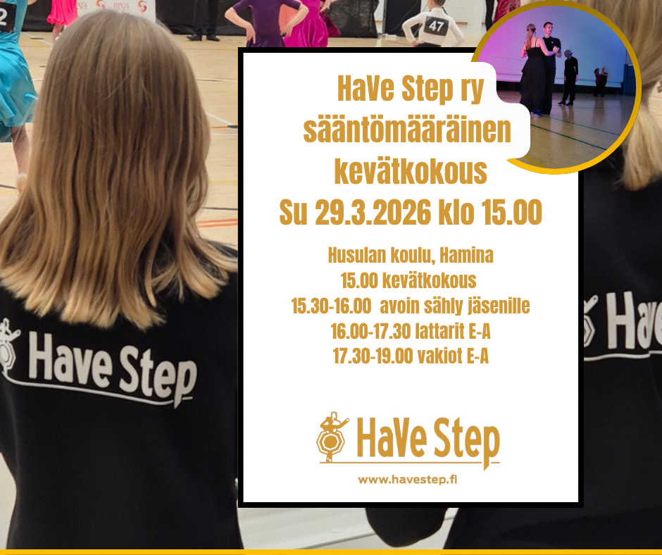 Tanssi hyvässä seurassaTervetuloa harrastamaan HaVe Steppiin! Seurassamme voit liikkua omaksi iloksesi tai tähdätä kilpalattioille. Tukenasi ovat ammattitaitoiset valmentajat sekä mukava treeniporukka. Tanssiminen sopii kaikille, eikä aloituksella ole ikärajaa. Tule rohkeasti kokeilemaan!